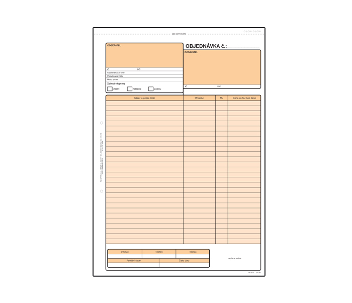Objednávka. Samopropisovací tiskopis. Blok obsahuje 100 listů odtržitelných perforací, se zakládacím děrováním. Oranžová obálka, nečíslovaný.Formát: A4 na výšku prečítať celé