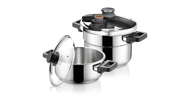 Luxusní tlakový hrnec se dvěma nádobami 4.0 a 6.0 l, univerzální tlakovou poklicí se snadným nastavením ideálního tlaku IDEALCOOK pro rychlou a šetrnou přípravu všech obvyklých pokrmů. Díky velkému otočnému uzávěru víka lze hrnec pohodlně uzavřít i otevřít jen jednou rukou. Tlakový hrnec ULTIMA...