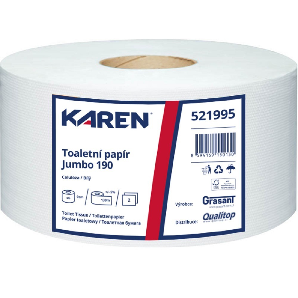 Vhodný do všech zásobníků určené pro toaletní papír JumboSložení: celulózaBarva: bíláNávin: 130 mBělost: 100%Počet vrstev: 2 prečítať celé