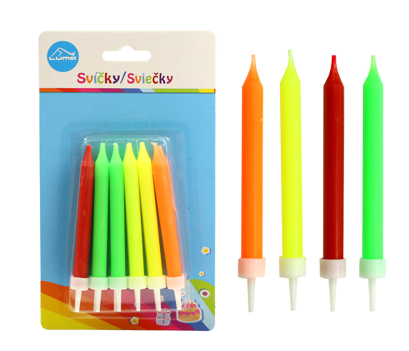 vhodná jako ozdoba narozeninového dortu- v neonových barvách- včetně stojánku na zapíchnutí- 12 ks v balení- průměr 8mm- výška 7cm prečítať celé
