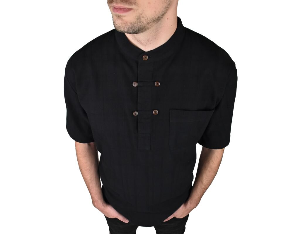 Pánská bavlněná kurta s krátkým rukávem.Popis: volný stříh, krátký rukáv, bez límečku, kapsa na hrudníku, zapínání na knoflíky. 100% bavlna.Tabulka velikostíVelikostHrudník cca (cm)Délka cca (cm)Rukáv cca (cm)S567623Textil, který nosíte, položte volně na stůl či jinou rovnou plochu. Změřte v...