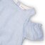 Bavlněná dívčí halenka na ramínka se spadlými volánkovými rukávy. Vzadu zapínání na knoflíky. Barva bílá s celoplošnými modrými proužky. Střih do písmene A. prečítať celé