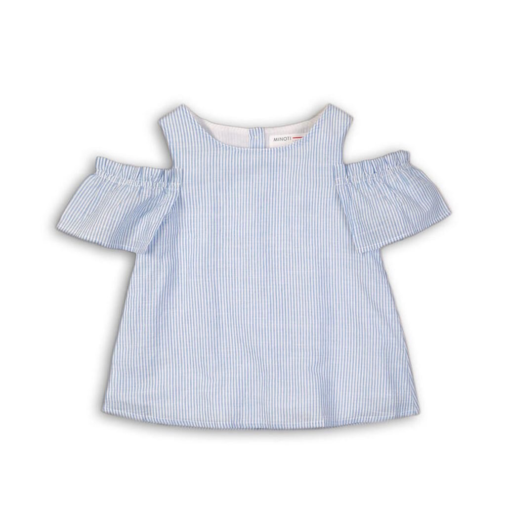 Bavlněná dívčí halenka na ramínka se spadlými volánkovými rukávy. Vzadu zapínání na knoflíky. Barva bílá s celoplošnými modrými proužky. Střih do písmene A. prečítať celé