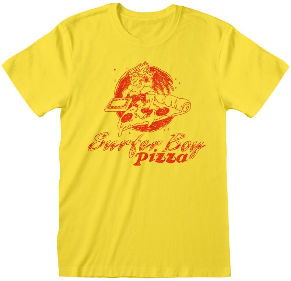 Žluté pánské tričko s motivem postavy Surfer Boy Pizza z amerického seriálu Stranger Things.