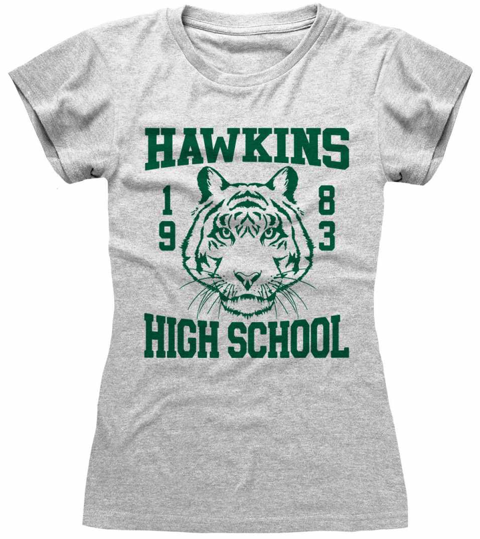 Šedé dámské tričko vyvedené v motivu střední školy v Hawkins ze seriálu Stranger Things.
