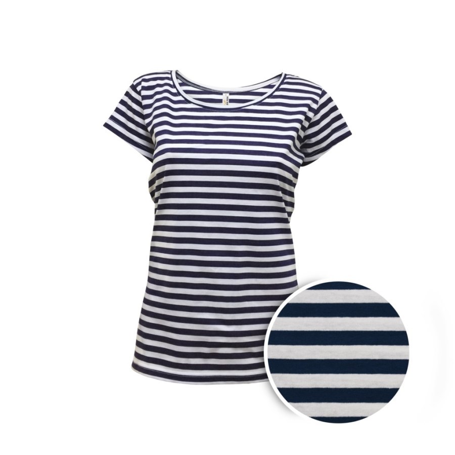 Modrobílé pruhované dámské tričko s krátkým rukávem, které je doplněné bílým průkrčníkem. Materiál: 100% česaná bavlna, silikonová úprava. prečítať celé
