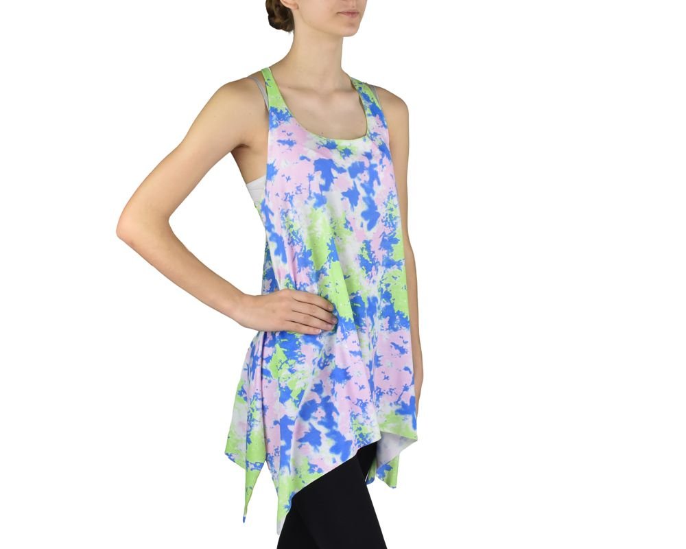 Popis: volný střih, široká ramínka vzadu stažená, kulatý výstřih, potisk, rovný spodní lem, na bocích ve spodní části rozparekMateriál: 65% polyester, 35% bavlnaRozměry:Šířka přes prsa: 45 cmŠířka v pase: 55 cmDélka: 70 cm