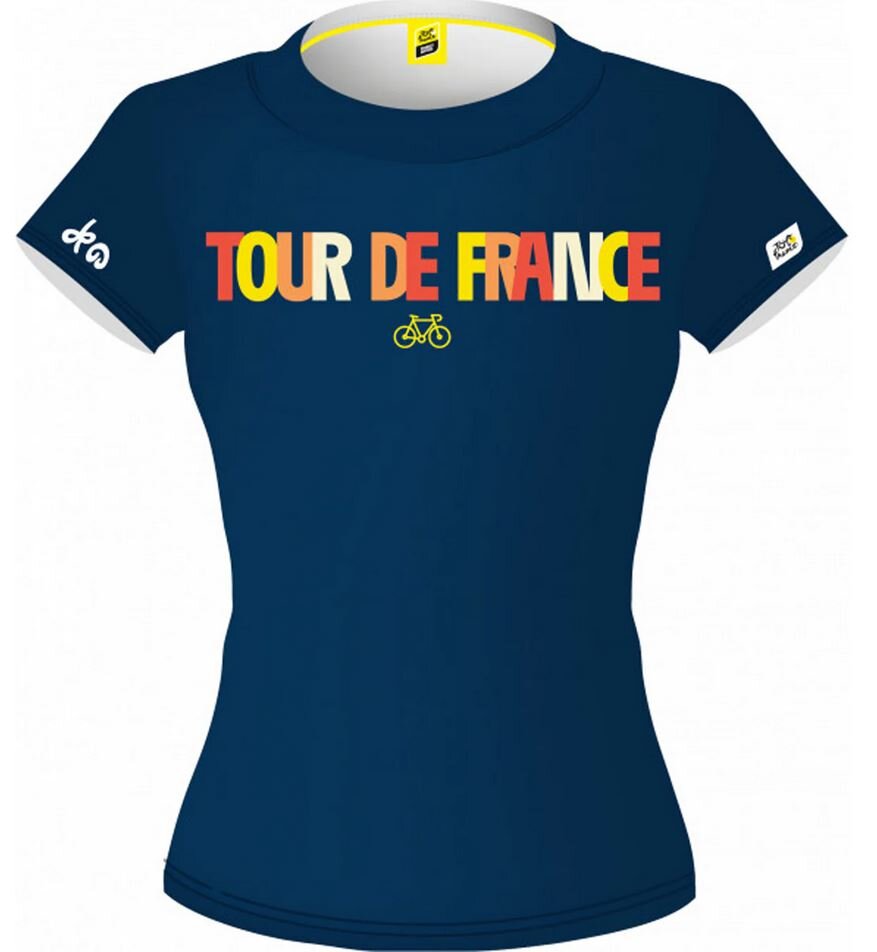Oficiální produkt - dámské tričko a doplňkové zboží z katalogu výrobků s logem a grafikou etapového cyklistického závodu Tour de France.Zboží je legálně licencováno a prodáváno se souhlasem vlastníků licenčních práv.Bílé navy blue tričko s barevným nápisem etapového cyklistického závodu Tour de...