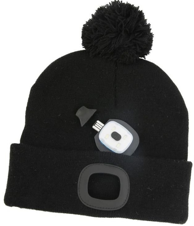 Teplá a pohodlná čepice s bambulí a vpředu s LED světlem (60 lm). Praktický pomocník v chladu při sportování, venčení Vašich mazlíčků či procházce večer, v noci nebo přes den při špatné viditelnosti. Univerzální velikost. 3 stupně intenzity světla – 50/75/100 %. Světlo lze snadno vyndat a čepici vyprat. Nabíjení přes USB port. Barva – černá. Doba nabíjení 3 hodiny. Doba svícení ± 2 hodiny. Baterie – 3,7 V Li-ion 300 mA.