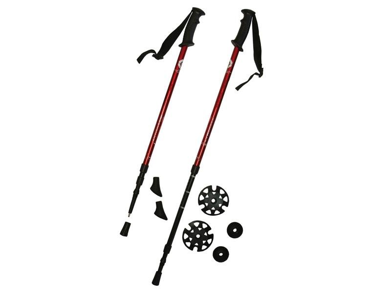 Teleskopické hole 3-dílné AL + grafit, NORDIC Walking, ANTISHOCK, 65 - 135 cm. 1 pár na kartě s příslušenstvím - vyměnitelné kroužky a gumové koncovky. Balení 1 pár na kartě + PE sáček. Hmotnost jedné hole je 290 g. K dispozici v barvě červené.