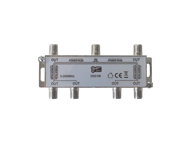 Anténní rozbočovač GSS106 (6 výstupů) Geti - počet vstupů: 1 - počet výstupů: 6 - pásmo: TV / SAT (5 - 2500 MHz)- průchozí útlum: : 47 - 1000 MHz - 11,8 dB / 2300- 2500 MHz - 16 dB - oddělovací útlum: ˃ 20 dB- průchod DC proudu na všech výstupech- zemnící šroubek- F...