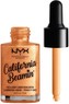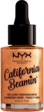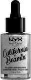 Tekutý rozjasňovač NYX Professional Makeup California Beamin 'Face & Body Liquid Highlighter díky svému třpytivému, vysoce intenzivnímu složení s reflexními perlami rozzáří obličej i tělo. Je plný avokádového, šípkového, hroznového a jojobového oleje, přesto není lepkavý a jeho struktura je krásně hladká.