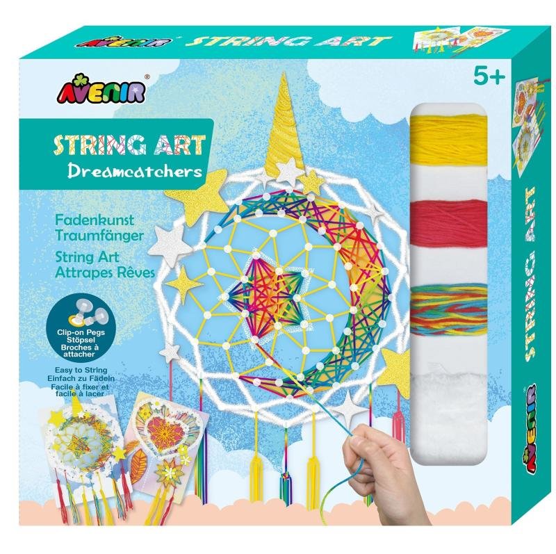 Vyrobte si krásné umělecké dílo s touto soupravou ze série Avenir! Barevný provázek opatrně omotejte a naviňte kolem kolíků a ozdobte, abyste dosáhli pohádkového výsledku. Navlékněte 2 krásné lapače a ozdobte je třpytivými samolepkami! Plastové kolíky zapadají do desky bez ostrých hrotů. Každé balení obsahuje 2 umělecké listy, umělé kolíčky, barevný provázek a krásné ozdobné kousky. 19,5 cm x 4 cm x 20,5 cm Věk 5+