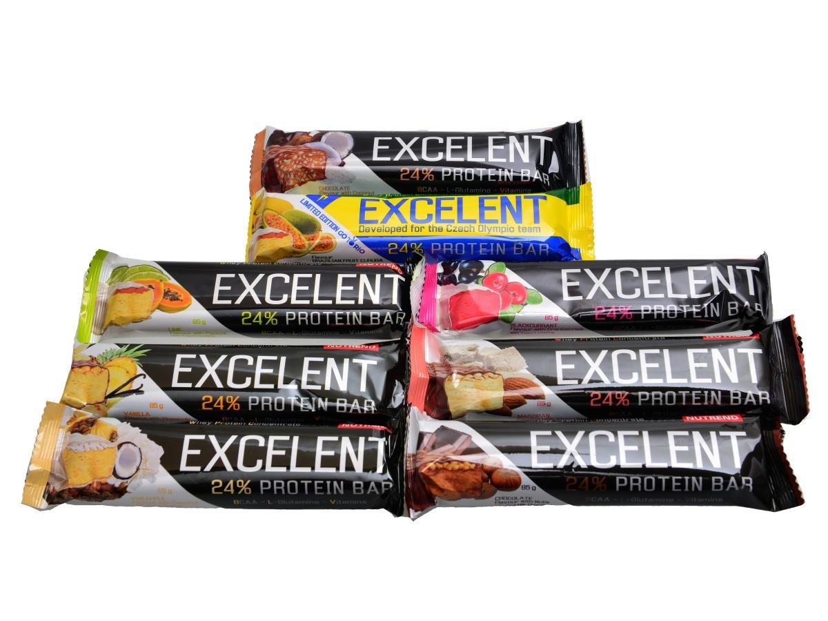 Excelent Protein Bar - Delikátní dvouvrstvá proteinová tyčinka. Excelent Protein bar je tyčinka bohatě posypaná ovocem či oříšky, zalité v čokoládě nebo jogurtové polevě. Excelent Protein bar obsahuje 24% bílkovin a 43% sacharidů. TA CHUŤ TĚ DOSTANE!