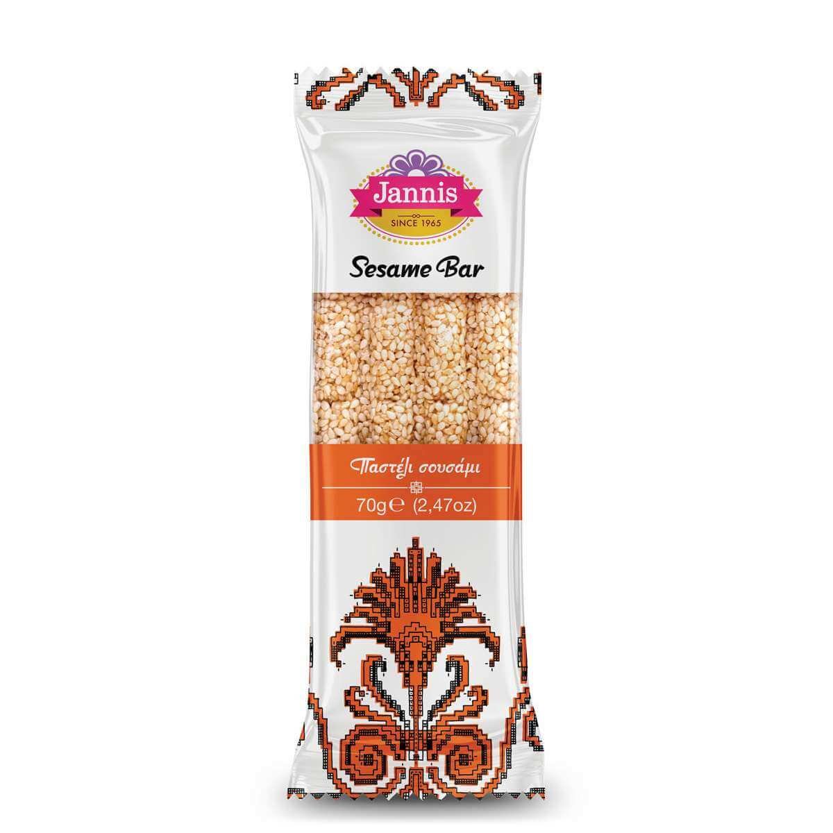 Jannis naturální Sezamová tyčinka s medemVysoký obsah vlákninyPřírodní zdroj bílkovinNeobsahuje lepekVhodné pro veganyNízký obsah soliNeobsahuje laktózuNeobsahuje mléčné výrobkyBez přídatných látekBez konzervačních látekNutriční hodnotyve 100gEnergie (kJ) / (kcal)2393 / 576Tuky41g- z toho...