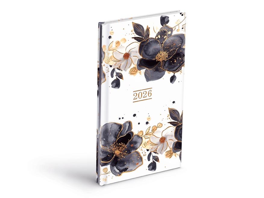 Váš společník po celý rok!Týdenní diář na rok 2026 je kombinací elegance a jemnosti. Jeho bílá plocha je pokryta výraznými květinovými motivy v černé a zlaté barvě. Tento design má romantický nádech, ale zároveň je moderní.Obálka je vyrobena z matného lamina s parciálním lakem, což jí dodává...
