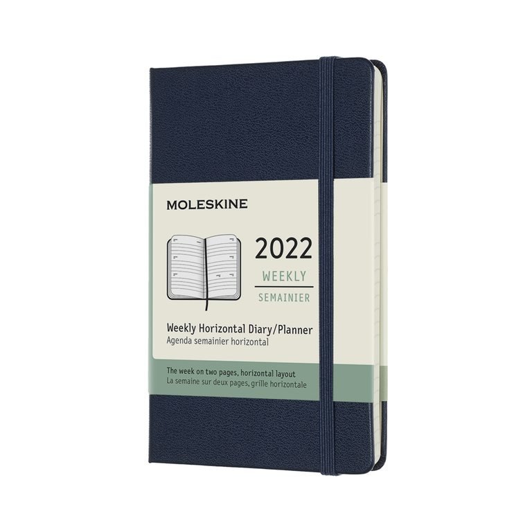 Modrý horizontální diář kapesní velikosti na rok 2022. Týden je zobrazen horizontálně na dvou stránkách (pondělí, úterý a středa nalevo, čtvrtek, pátek, sobota a neděle napravo). Diář má pevnou vazbu v kartonových deskách. Obepíná ho pružná páska proti samovolnému otevírání. Obsahuje praktickou...
