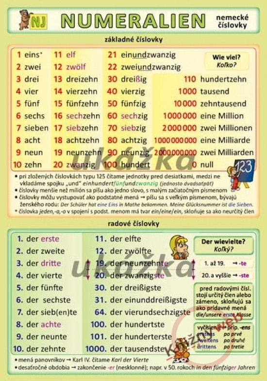 Kompletne spracovaný prehľad nemeckých čísloviek, ktorý pomôže zvládnuť gramatiku malým aj veľkým školákom. základné číslovky, radové, násobné, druhové zlomky, počítanie, desatinné čísla dátum, letopočet, určovanie času pútavé ilustrácie od Petra Kopla prečítať celé