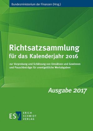 Das Bundesministerium der Finanzen hat bundeseinheitliche Richtsätze zur Verprobung und Schätzung von Umsätzen und Gewinnen für das Kalenderjahr 2016 sowie zu den Pauschbeträgen für unentgeltliche Wertabgaben für die Kalenderjahre 2016 und 2017 herausgegeben. Diese Broschüre enthält die amtliche Richtsatzsammlung in übersichtlicher und praxisgerechter Form.