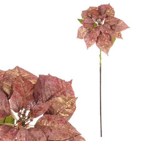 Využijte pro vánoční výzdobu tuto umělou vánoční hvězdu ve svátečním barevném provedení. Jedná se o řezanou formu této oblíbené rostliny, která má pozlacené růžové listy a střed. Tato umělá varianta jednak skvěle vypadá, ale taktéž nabízí trvalou možnost jejího použití, a to i v mnoha dalších letech.