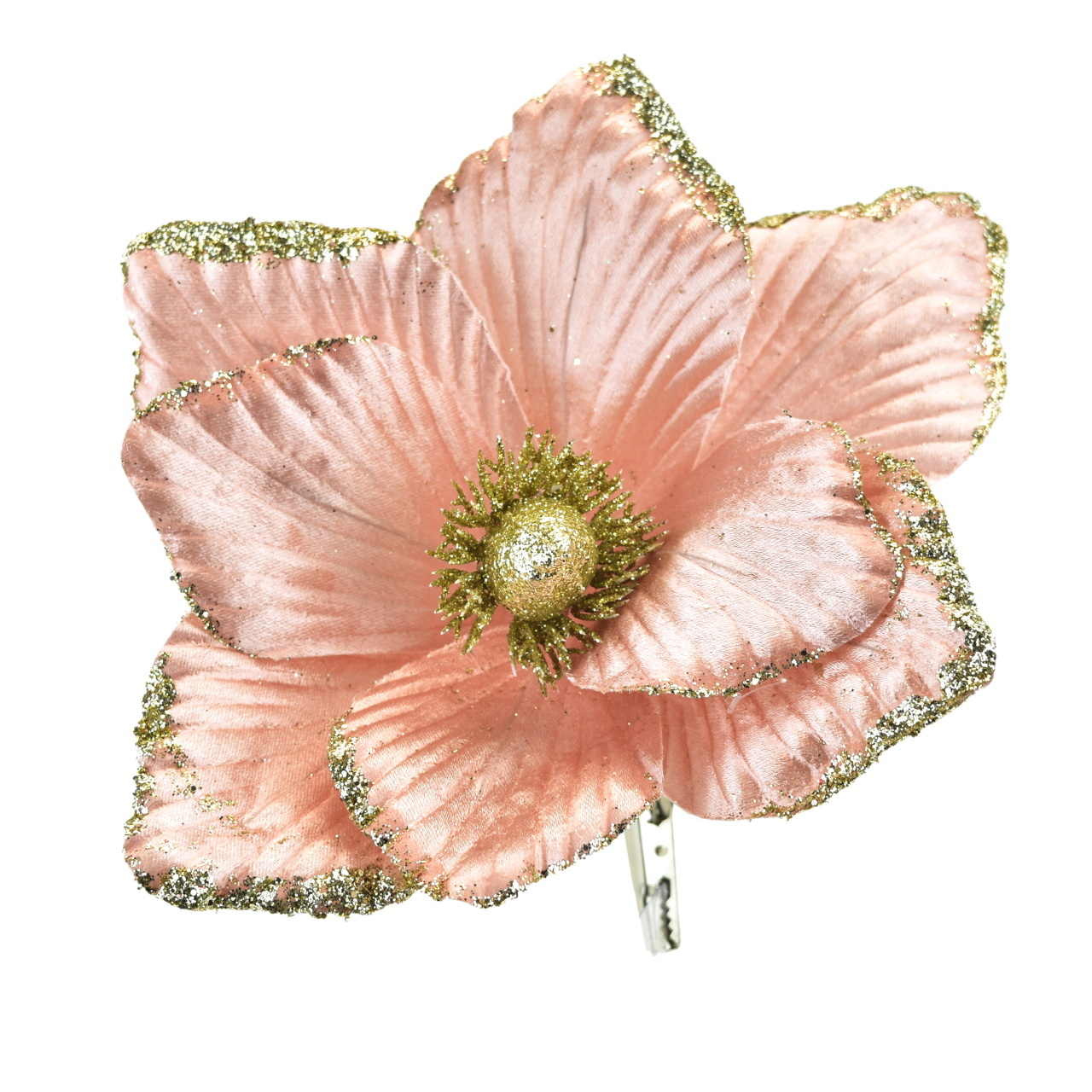 Máme pro vás skvělou vánoční ozdobu! Jedná se o úžasný růžový květ magnólie s průměrem 20 cm. Tento květ je vyrobený z kvalitního textilu a kovu, a navíc je potažený zlatým glitrem, který dodává celé ozdobě nádherný lesk. Stačí ho jednoduše vysunout z krabice a přišpendlit na váš stromeček. V...