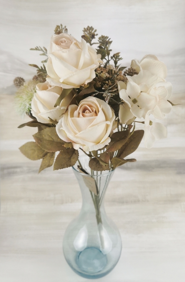 Umělá kytice růže / bodláky / hortenzie 28 x 28 cm, bílá