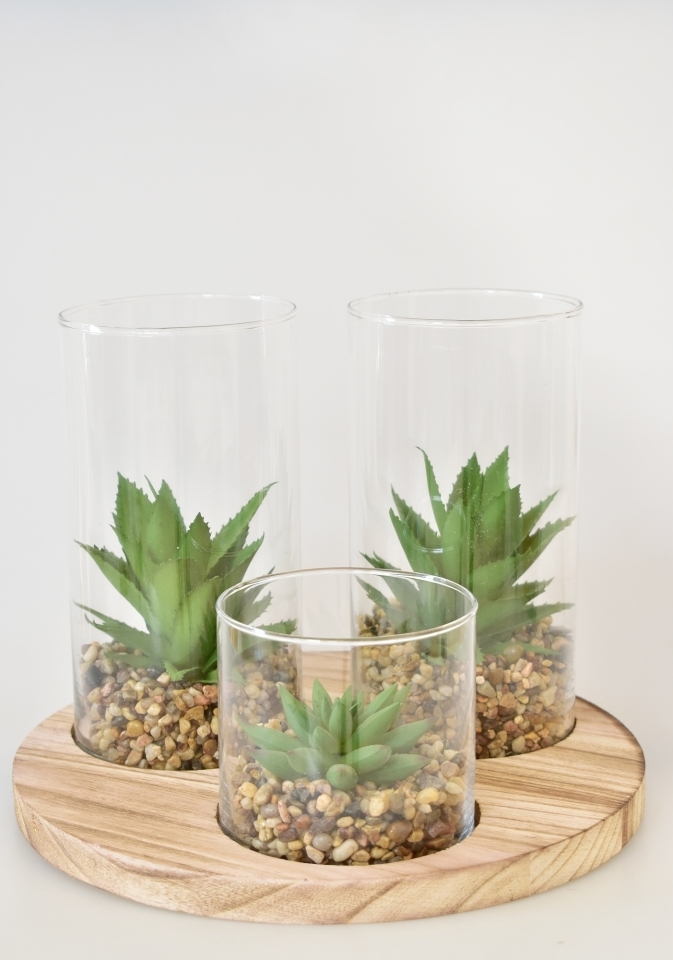 Sukulenty ve skleněných válcích na dřevěné podložce B