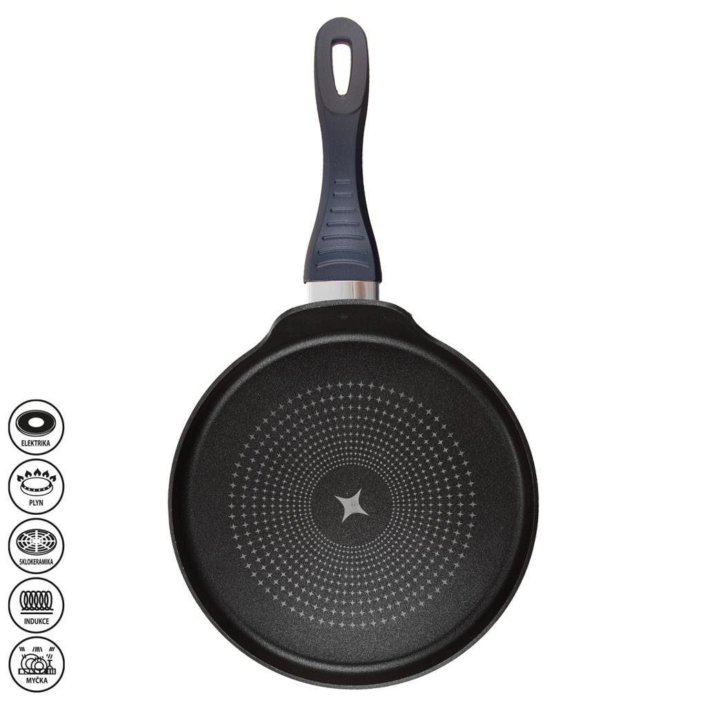 Pánev palačinková Diamant překvapí svými jedinečnými užitnými vlastnostmi. Vnitřní nepřilnavý povrch diamantového vzhledu vyniká skvělou tepelnou vodivostí a varnými vlastnostmi. Materiál: vysoce kvalitní slitina hliníku s prvotřídním nepřilnavým povrchem, bakelit, kov. Nepřilnavý povrch s...