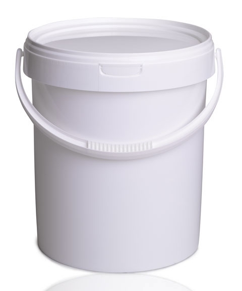 Plastový bílý kbelík s víkem s pojistkou a uchem pro přenášení. Vhodné pro skladování pevných a kapalných látek. Vyrobeno z polypropylenu (PP) a mají ve většině případů originální uzavírání (pojistku na otevření). Objem 15000 ml, průměr 27.2 cm a výška 32.4 cm. Vhodné pro styk s potravinami. EAN