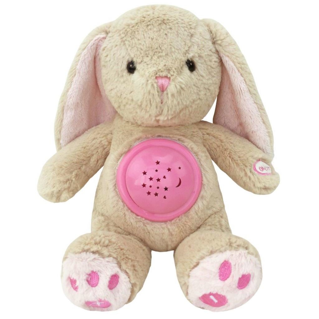 Roztomilý plyšový králíček s projektorem Baby Mix. Po stisknutí tlačítka umístěného na tlapce zapnete světýlko které mění barvu a poslouží jako maličká noční lampička a zároveň se spustí jemné melodie. V zadní části je umístněný strojek na baterie. Zapnout a vypnout lze tlačítkem on/off. Baterie jsou součástí balení. Typ AA 1,5 V. Hračka je vhodná pro děti od 6 měsíců. Rozměry: cca 34 cm.