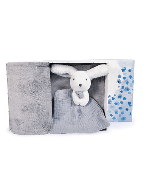 Doudou Dárková sada šťastný králíček modro-šedý usínáček