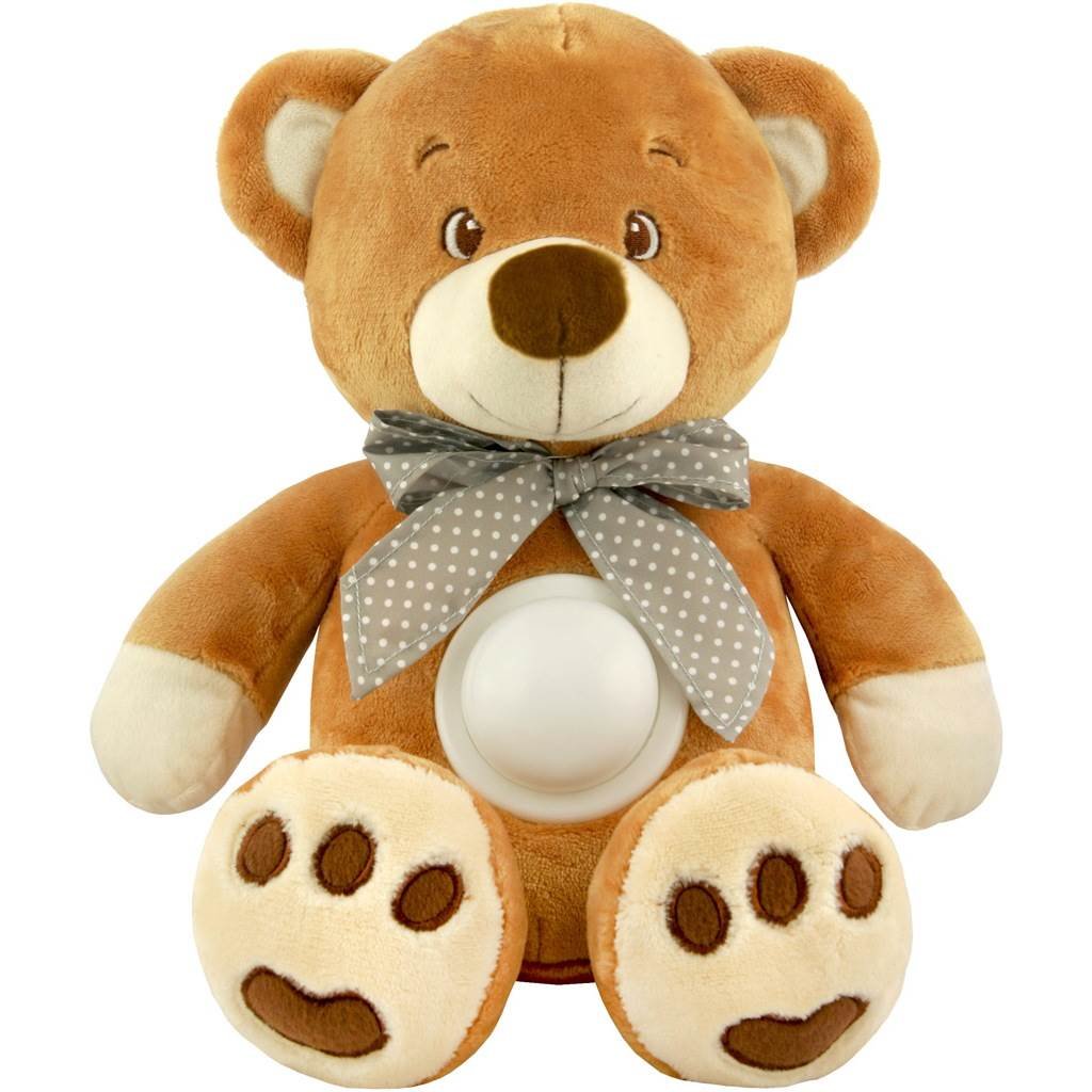 Roztomilý plyšový medvídek s projektorem Baby Mix. Po stisknutí tlačítka umístěného na bříšku zapnete světýlko které mění barvu a poslouží jako maličká noční lampička a zároveň se spustí jemné melodie. V zadní části je umístněný strojek na 3 baterie. Zapnout a vypnout lze tlačítkem on/off....