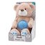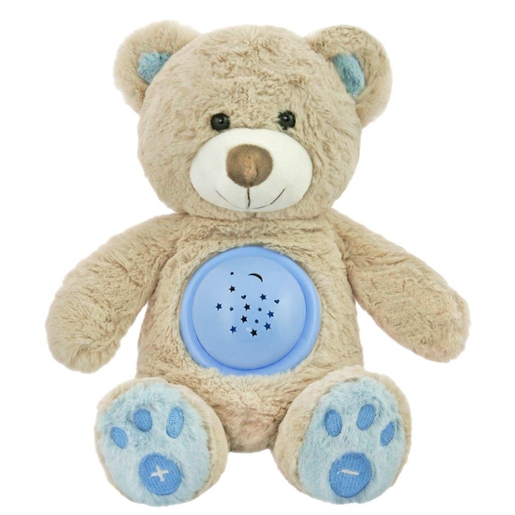 Roztomilý plyšový medvídek s projektorem Baby Mix. Po stisknutí tlačítka umístěného na tlapce zapnete světýlko které mění barvu a poslouží jako maličká noční lampička a zároveň se spustí jemné melodie. V zadní části je umístněný strojek na baterie. Zapnout a vypnout lze tlačítkem on/off. Baterie jsou součástí balení. Typ AA 1,5 V. Hračka je vhodná pro děti od 6 měsíců. Rozměry: cca 34 cm.