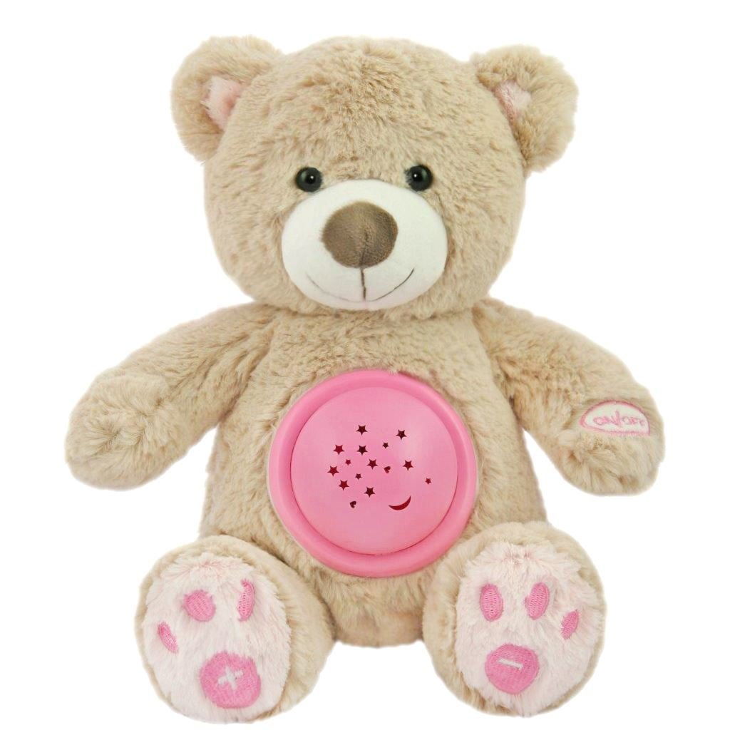 Roztomilý plyšový medvídek s projektorem Baby Mix. Po stisknutí tlačítka umístěného na tlapce zapnete světýlko které mění barvu a poslouží jako maličká noční lampička a zároveň se spustí jemné melodie. V zadní části je umístněný strojek na baterie. Zapnout a vypnout lze tlačítkem on/off. Baterie jsou součástí balení. Typ AA 1,5 V. Hračka je vhodná pro děti od 6 měsíců. Rozměry: cca 34 cm.