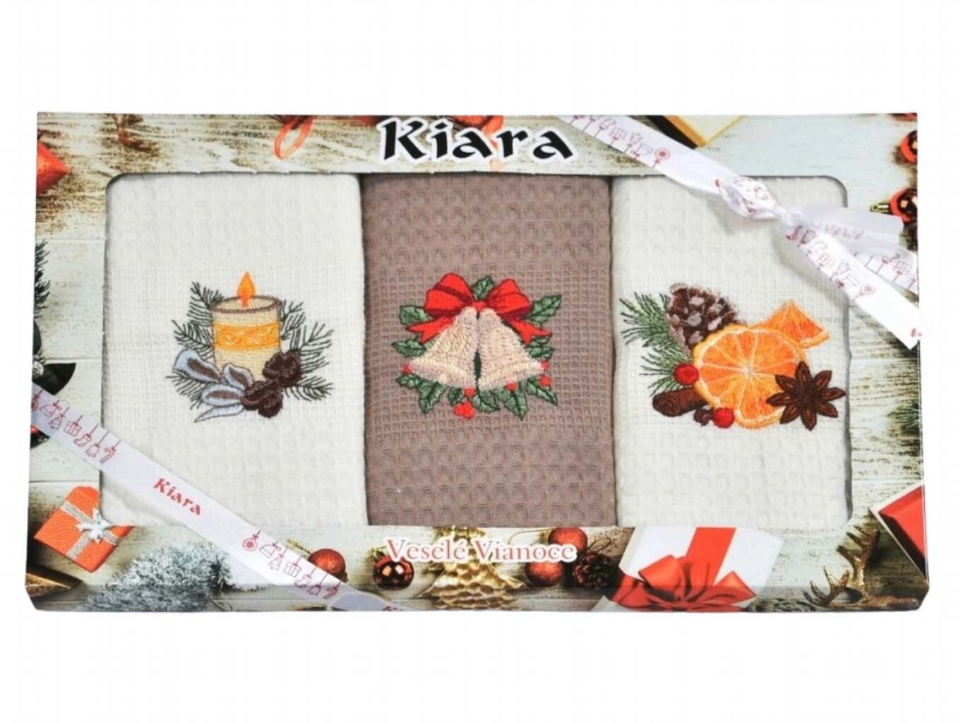 Vánoční dárková sada utěrek – Krémová a hnědá (3 ks) Luxusní sada tří vánočních utěrek v krémové a hnědé barvě s výšivkami svíčky, zvonečků a vánočního koření. Elegantní balení s nápisem „Veselé Vánoce“ potěší každého milovníka sváteční atmosféry. Materiál a zpracování Utěrky jsou vyrobeny ze...