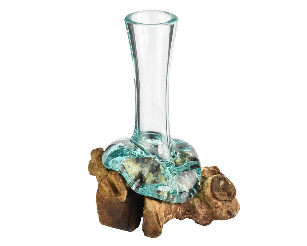 Tato skleněná váza kombinuje ručně tvarované sklo s podstavcem z přírodního dřeva. Váza slouží jako praktická nádoba na květiny nebo dekorace, zároveň působí jako stylový doplněk do interiéru. Díky přirozené struktuře dřeva a jedinečnému tvaru skla je každý kus originální.Váza přináší do prostoru jednoduchý, přírodní prvek, který dobře zapadne do moderních i klasických interiérů.Parametry:Průměr hrdla: cca 4 - 5 cmŠířka: 15 - 20 cmVýška: 9 - 10 cm