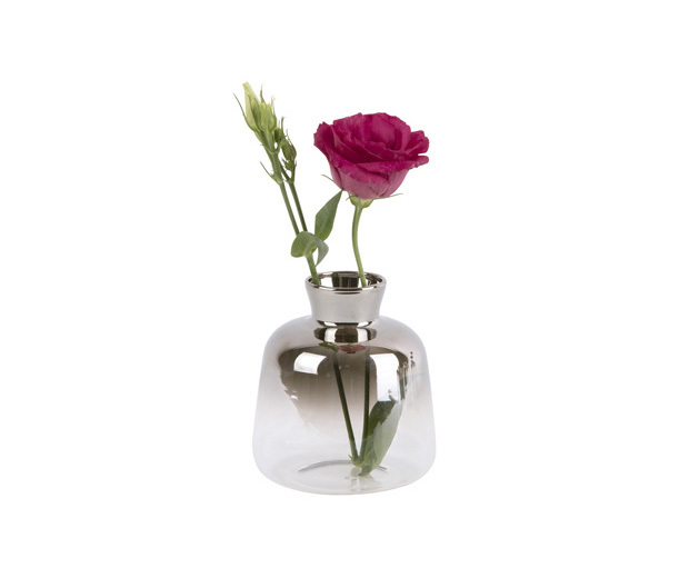Skleněná mini váza stříbrné barvy.