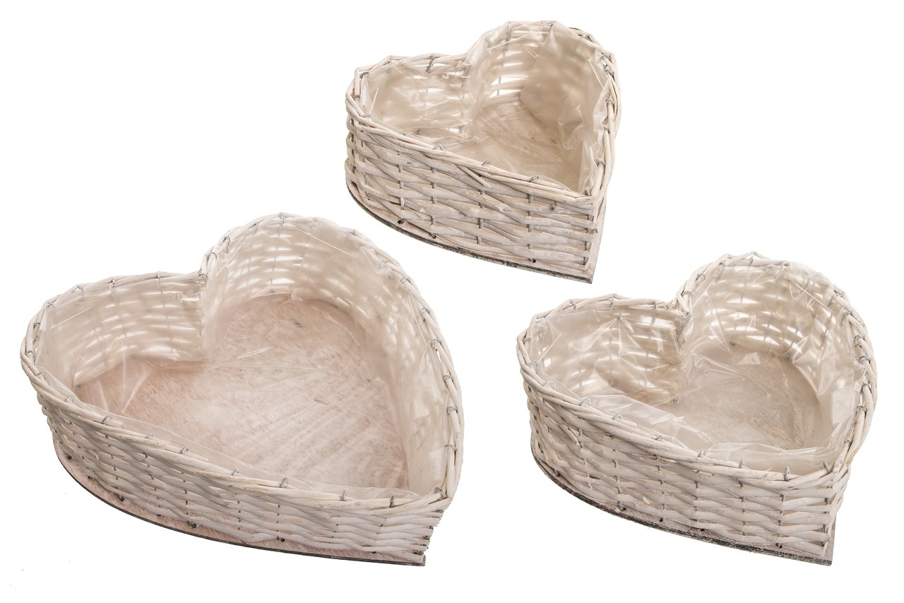 Sada tří košíků ve tvaru srdce s plastovým vkladem. Zasaďte si do nich květiny a užívejte si jejich krásu.Materiál: plast, proutíRozměry:Největší košík35x10x33 cmNejmenší košík19x8x19 cm1 balení = 3 ks prečítať celé