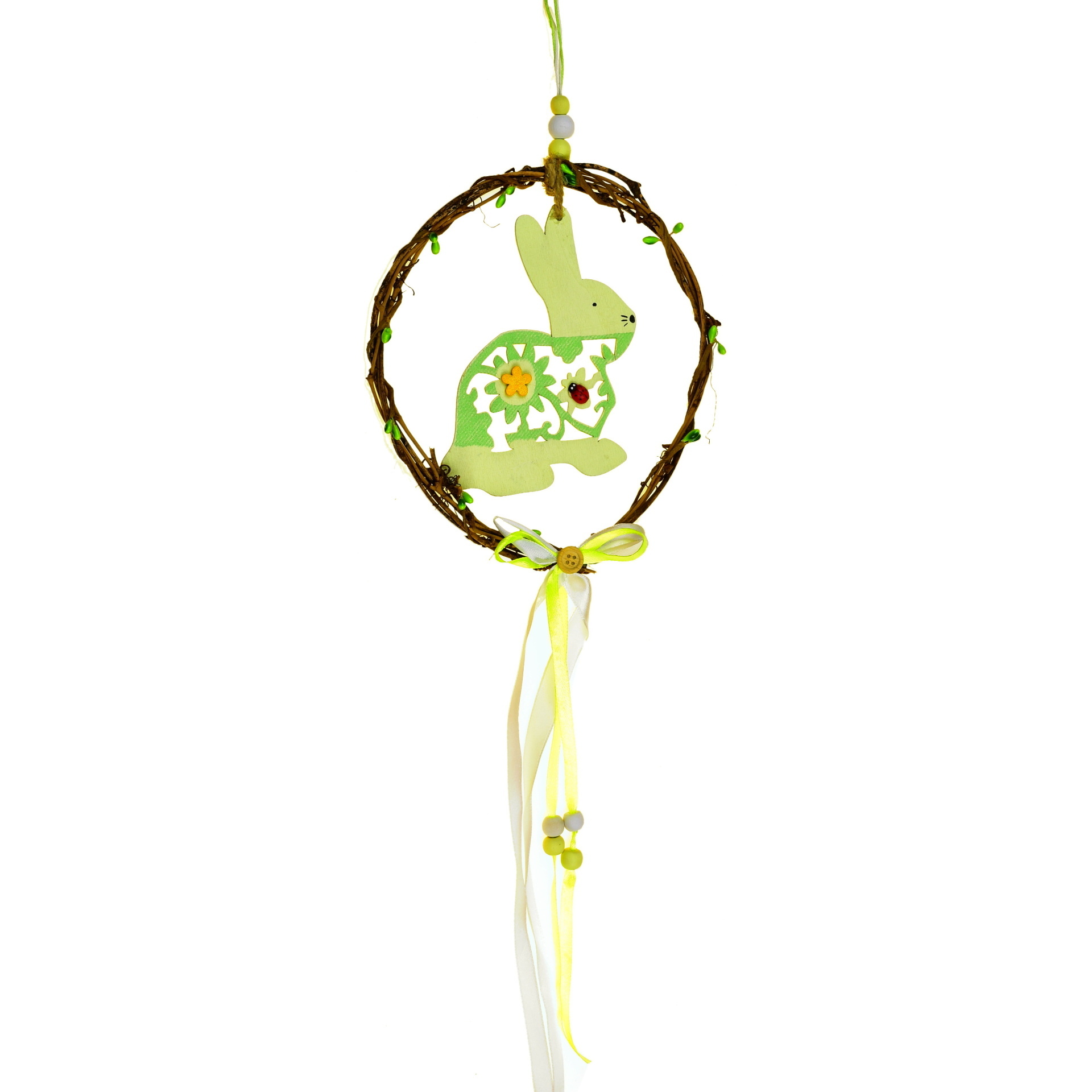 Věneček se zajíčkem na zavěšení o velikosti 30 cm je jedinečná proutěná závěsná dekorace, která oživí vaše interiéry a přinese jarní atmosféru do vašeho domova. Tento krásný Velikonoční a jarní dekorační prvek je zdoben roztomilým zajíčkem a barevnými stuhami, které dodávají veselý nádech. Perfektní pro zavěšení na stěny, dveře či okna.