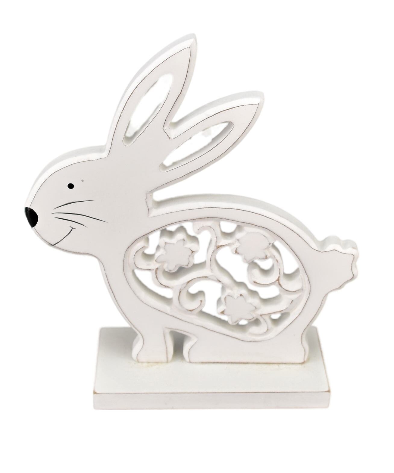 Velikonoční dřevěný zajíček s perforovanou výplní kytiček v bílé barvě.Mareriál: překližka,  velikost: 16,5 x 14 cm (v. x š.) prečítať celé