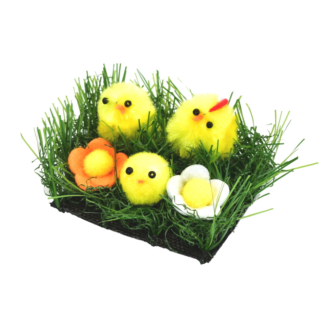 Velikonoční kuřátka (3ks) v trávě s bílými kytičkami (2ks).Materiál: plast, flís, plyš.Velikost: výška 3,5 cm, šířka 6,5 cm, délka 5,5 cm. prečítať celé