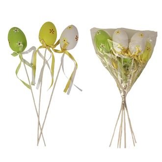 Sada dekoračních zápichů s vajíčky. Sada obsahuje 6 zápichů. Rozměry : průměr 4 cm, výška 6 cm, celková délka zápichu 38 cm. Barva : zelená, žlutá, bílá. Materiál : plast, dřevo, stuha. prečítať celé