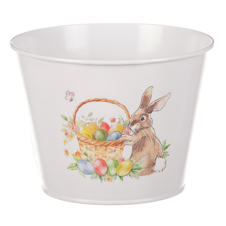 Velký kovový obal na květiny s velikonočním designem bude dokonalým doplňkem vaší sváteční výzdoby. S vyobrazeným zajíčkem a barevnými vajíčky v košíku na bílém podkladu, dodá prostoru tu pravou velikonoční atmosféru. Společně s jarními květinami v nich zasazenými, bude vytvářet neodolatelný celek, který přinese svěžest, barevnost a optimismus. Květiny budou v obalu chráněné a vypadat fantasticky.