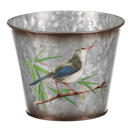 Kovový obal na květiny, design s ptáčky.