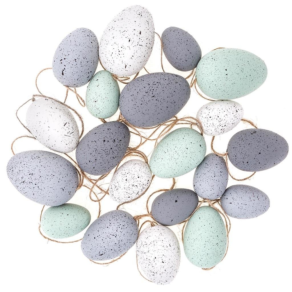 Elegancki zestaw delikatnie nakrapianych jajek z zawieszką, w stonowanych odcieniach szarości i mięty.Pisanki zostały pokryte matową farbą na bazie wody. Wysoka jakość wykonania sprawia, że prezentują się bardzo naturalnie. Niezastąpione przy...