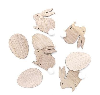 Zestaw drewnianych kształtów z motywem króliczków z pomponikiem i jajek.Idealne do wykorzystania w róznych pracach kreatywnych, projektach typu cardmaking, scrapbooking i homedecor.Pęknie prezentują się w naturalnej postaci, ale można je również ozdobić wszelkimi technikami...