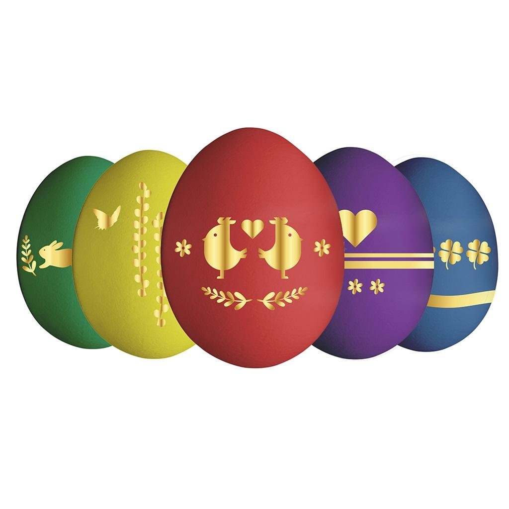 Zestaw do dekoracji pisanek. W opakowaniu znajdują się barwniki w 5 kolorach oraz złote naklejki na jajka w różnych wzorach. Kolory barwników: żółty, czerwony, fioletowy, zielony, niebieski. Gotowy zestaw do zrobienia niebanalnych pisanek. Sposób użycia produktu znajduje się na opakowaniu. Barwniki są przeznaczone wyłącznie do barwienia jaj.