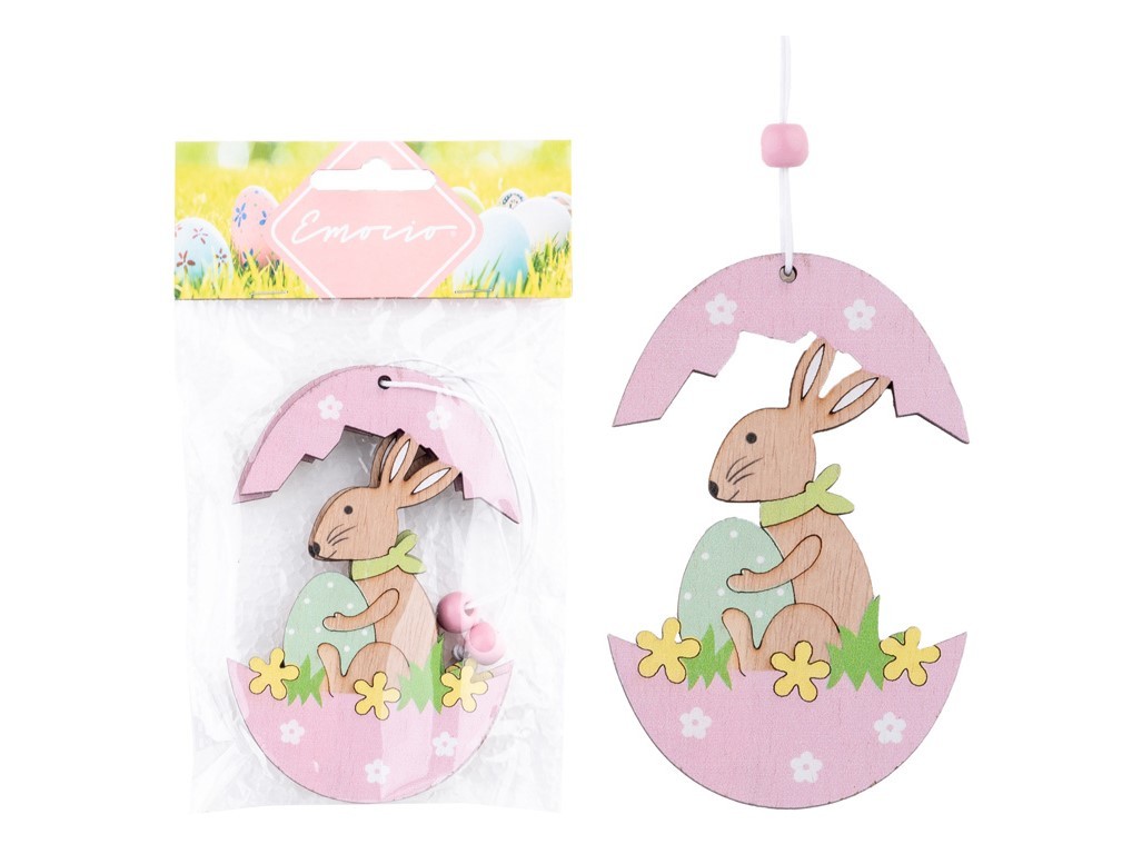 Závěs dřevo 2ks 70x110mm zajíček s vajíčkem uprostřed skořápky, přírodní, barevná