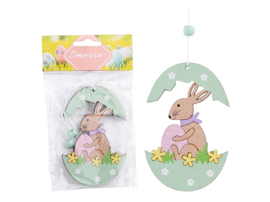 Závěs dřevo 2ks 70x110mm zajíček s vajíčkem uprostřed skořápky, přírodní, barevná