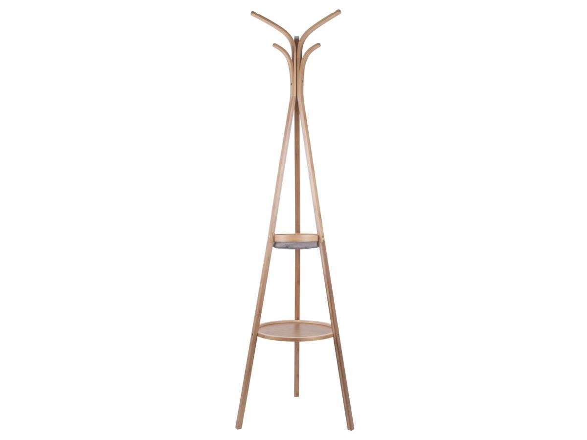 Stojanový věšák v hnědé barvě z bambusu se dvěmi odkládacími policemi.